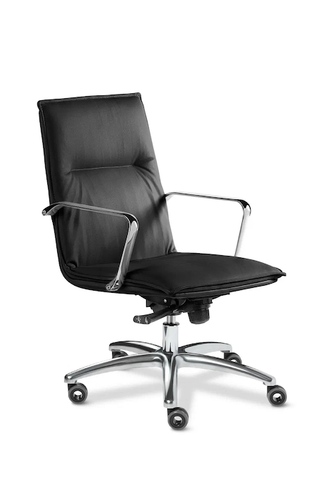 Кресла модели Epsilon - это прекрасный выбор для наполнения офисных пространств, сочетают в себе классическую форму, практичность и приятную эргономику. Кресло руководителя Epsilon B - выполняется с низкой спинкой, крестовина и подлокотники из полированного алюминия. Дизайн кресла лаконичен, сочетает в себе строгость и элегантность. Кресло оборудовано механизмом качания с регулировкой под вес и фиксацией в четырёх положениях - "Мультиблок" (может быть укомплектовано и другими механизмами такими как - "Топган-Люкс"), а так же регулировкой высоты за счет установленного в крестовине кресла газо-масляного амортизатора (газпатрона) 3-ей категории стабильности (DIN 4550 class 3), категория повышенной надёжности: газпатрон выдерживает нагрузку в 200 тысяч циклов при динамической стендовой нагрузке в 80 кг. Минимальное давление, при котором срабатывает газпатрон - 21,5 кг, максимальное - около 150 кг. Толщина поролона на сиденье и на спинке 30 мм. Применяемая марка поролона 30/40 и 18/30 (плотность/жесткость) обеспечивает долговечность кресла. Каркас кресла выполнен из гнутоклееной фанеры в виде ковша. Толщина каркаса - 17 мм. Чехол кресла выполнен из черной или цветной мебельной, натуральной кожи сквозного крашения со среднезернистым тиснением из цельных шкур крупного рогатого скота, задняя часть спинки по евростандарту из кожзама (компаньона) в цвет кожи. Толщина шкуры в стандартной точке 0,9-1,1мм. Также чехол может быть выполнен из экокожи ("Орегон") или микровелюра, вельвета, рогожки. Чехол кресла состоит из трёх частей - сидения, спинки и подголовника, без утяжек и строчек, имеет стильную окантовку-прострочку по кругу. Все указанные материалы экологичные и износостойкие. Крестовина и подлокотники кресла - литые, выполнены из полированного алюминия. Крестовина выдерживает нагрузку до 150 кг. Подлокотники без кожаных накладок. Ролики - паркетные прорезиненные (обеспечивают сохранность паркета, ламината). Каждый ролик рассчитан на нагрузку в 30 кг.